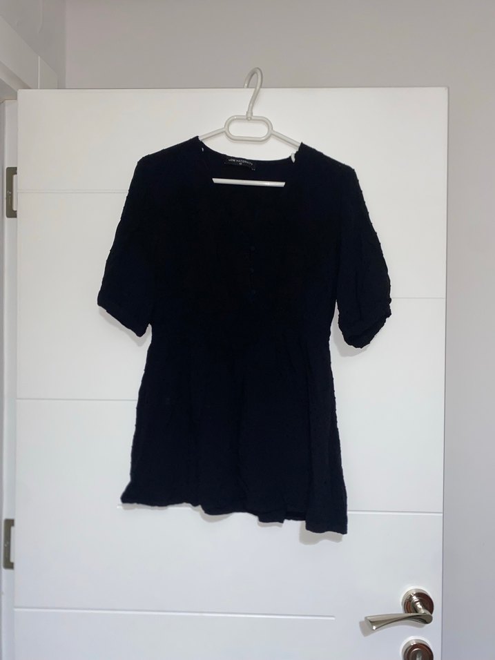 Siyah keten bluz, kısa kollu ve V yakalı, rahat kesimiyle günlük kullanıma uygun şık bir parça.