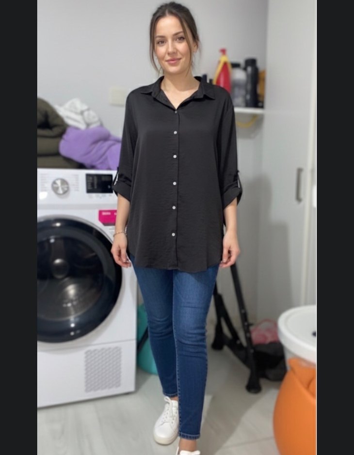 Siyah keten kumaştan, uzun kollu, düğmeli ve V yakalı kadın gömlek. Rahat kesim ve normal midi boyda, ofis için uygun.
