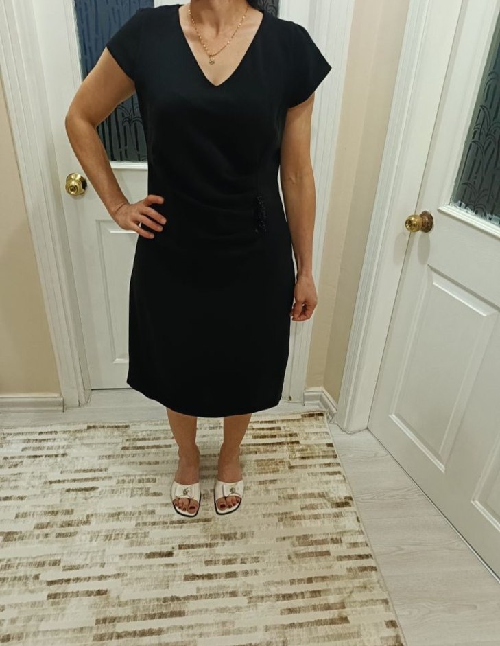 1 defa giyilmiş, 7 beden yazıyor etikette, 44 bedendir. Büyük beden yanı taşlı siyah şık abiye elbise. V yaka, kısa kollu, diz altı(midi boy), sade ama şık kesim. Tok, kaliteli ve dökümlü kumaş. Rahat ve vücuda güzel oturur. Hem günlük kullanım hem de özel davetler için uygundur. Ofis, yemek daveti veya özel günlerde zarif bir görünüm sağlar. Profilimdeki diğer abiye/elbise modellerine de göz atabilirsiniz #siyahaşkı #zarifelbise #kadınmoda #44beden #yenigibi #midielbise #şıkstil #ofiselbisesi #günlükelbise #rahatmodel #abiye #büyükbeden #elbise #siyah