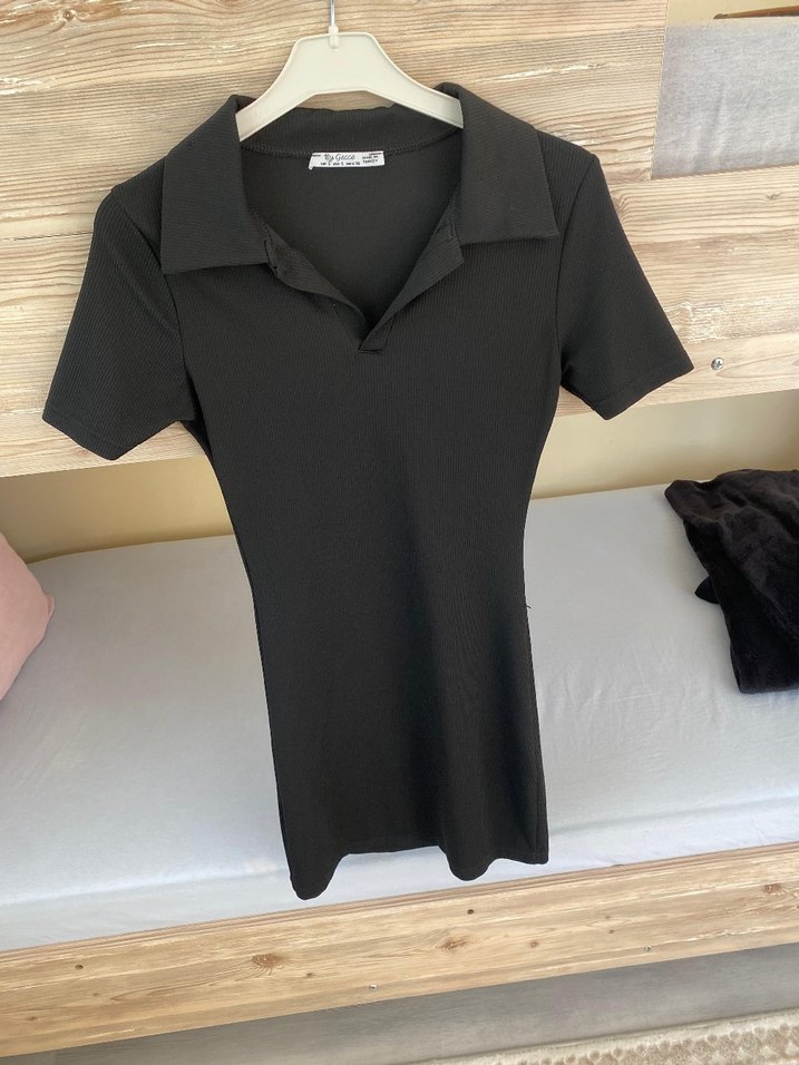 V yakalı, kısa kollu, siyah midi elbise. Düz ve şık tasarımıyla günlük kullanıma uygundur. Rahat ve esnek sentetik kumaştan üretilmiştir.