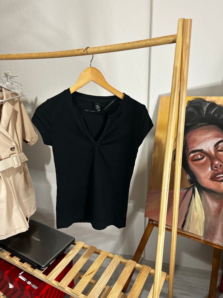 Siyah V Yakalı Kısa Kollu Kadın Tişört