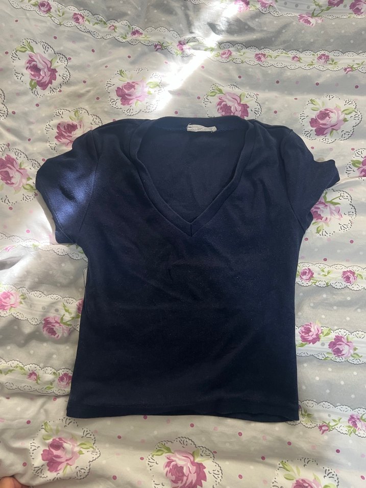 V yakalı, kısa kollu, siyah renkli, oturan kesime sahip kadın tişörtü. Düz desensiz ve sentetik kumaştan, günlük rahat goth tarzına uygun.