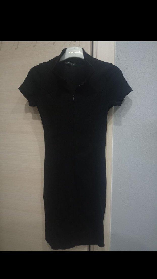 V yakalı, kısa kollu, vücuda oturan siyah midi elbise, pürüzsüz sentetik kumaştan yapılmış, günlük kullanım için uygun gotik tarzda.