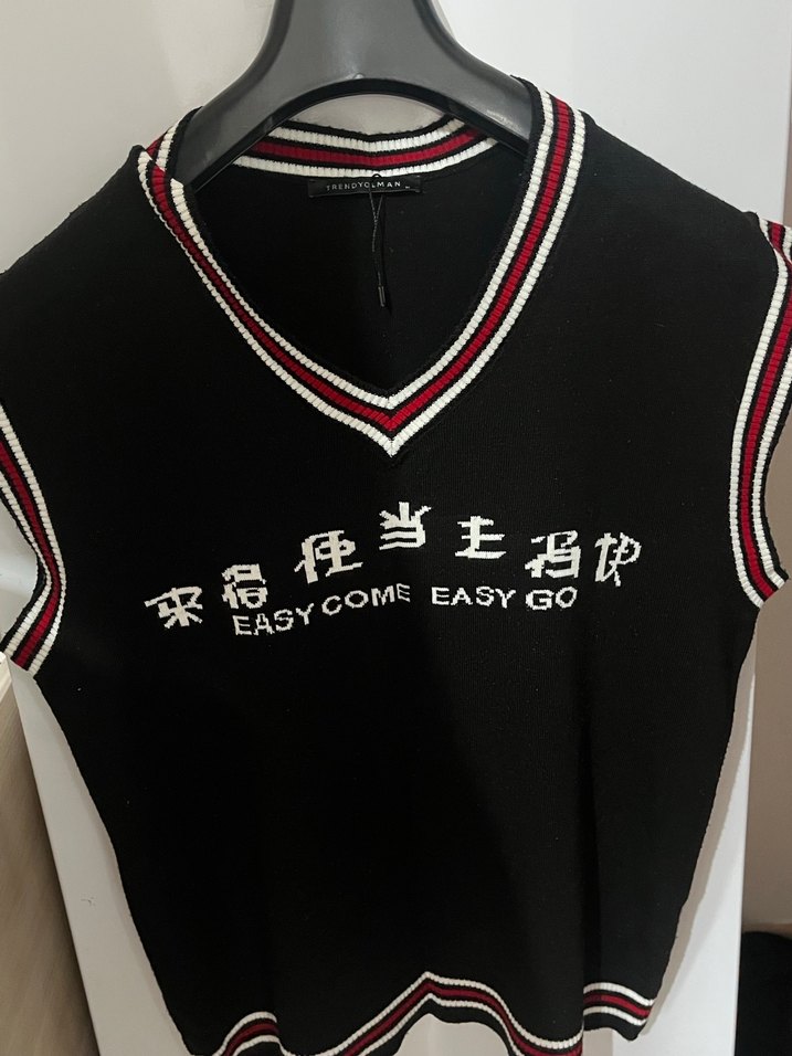 Siyah renkli, V yakalı ve kısa kollu triko süveter. Gevşek kesim, baskılı desen ve şerit detaylarıyla sokak modası ve athleisure tarzını birleştirir.