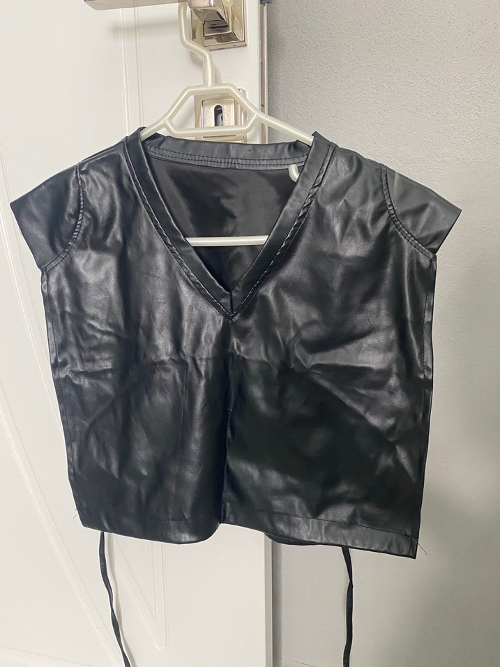 Siyah kolsuz deri süveter, V yakalı ve kemerli bel ile bol kesimdir. Kısa, mini boyda, gotik tarzda sokak modasına uygundur.