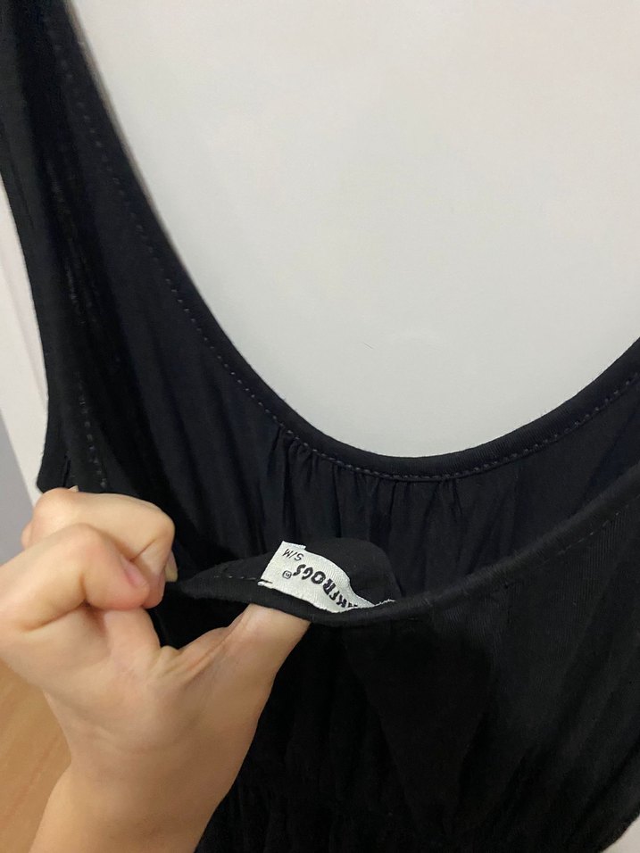 Siyah renkte, V yakalı ve kolsuz hamile tulumu, vücuda oturan kesimi ve fermuar detayıyla midi boydadır. Günlük kullanıma uygundur.