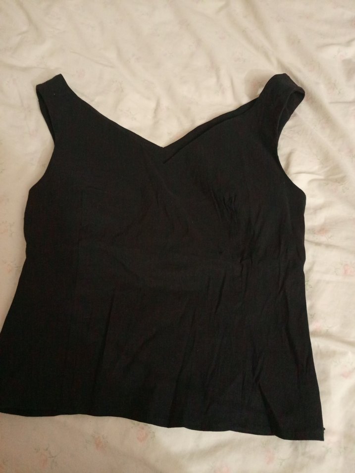V yakalı, kolsuz, siyah keten kumaştan yapılmış, normal uzunlukta ve vücuda oturan kadın atlet. Minimalist gotik tarzıyla günlük kullanım için şık ve sade.
