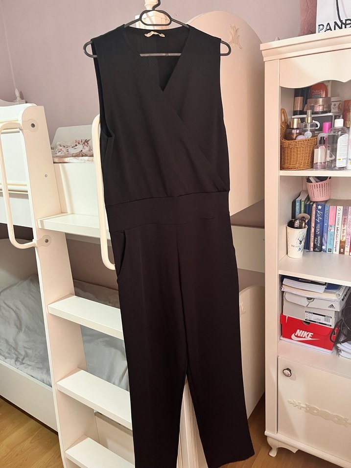 Siyah kolsuz tulum, V yakalı ve kemerli bel detaylıdır. Düzenli kesim, midi boy ve yumuşak sentetik kumaştan yapılmıştır, ofis kullanımı için uygundur. hiç giyilmedi