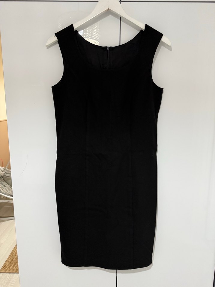 Siyah, kolsuz ve V yakalı bu midi elbise, ofis kullanımı için uygun, şık ve sade bir görünüme sahiptir.