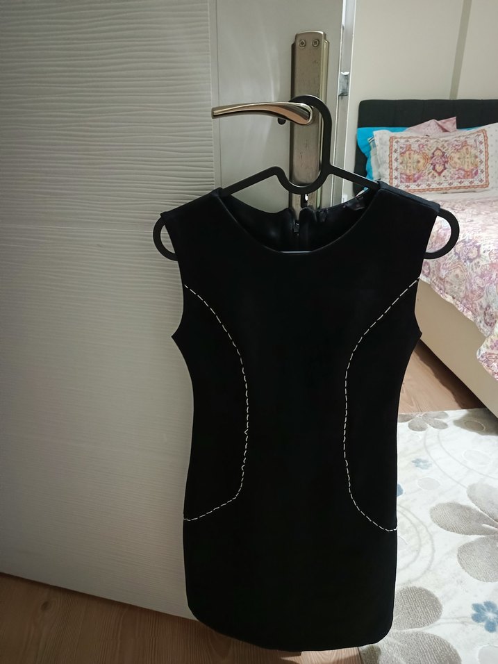 Bu siyah, kolsuz ve V yakalı midi elbise, sırtında fermuar detayına sahiptir. Minimalist goth tarzıyla günlük kullanım için şık bir siluet sunar.