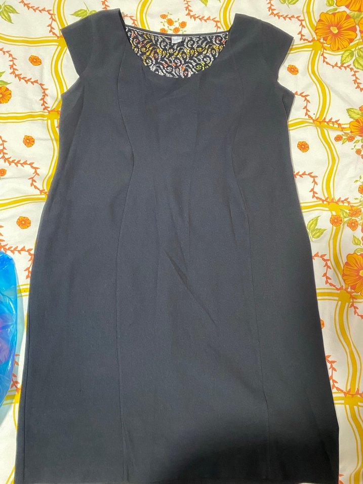 Kolsuz, V yakalı, drapeli siyah midi elbise, ofis için şık ve trend bir seçenektir.