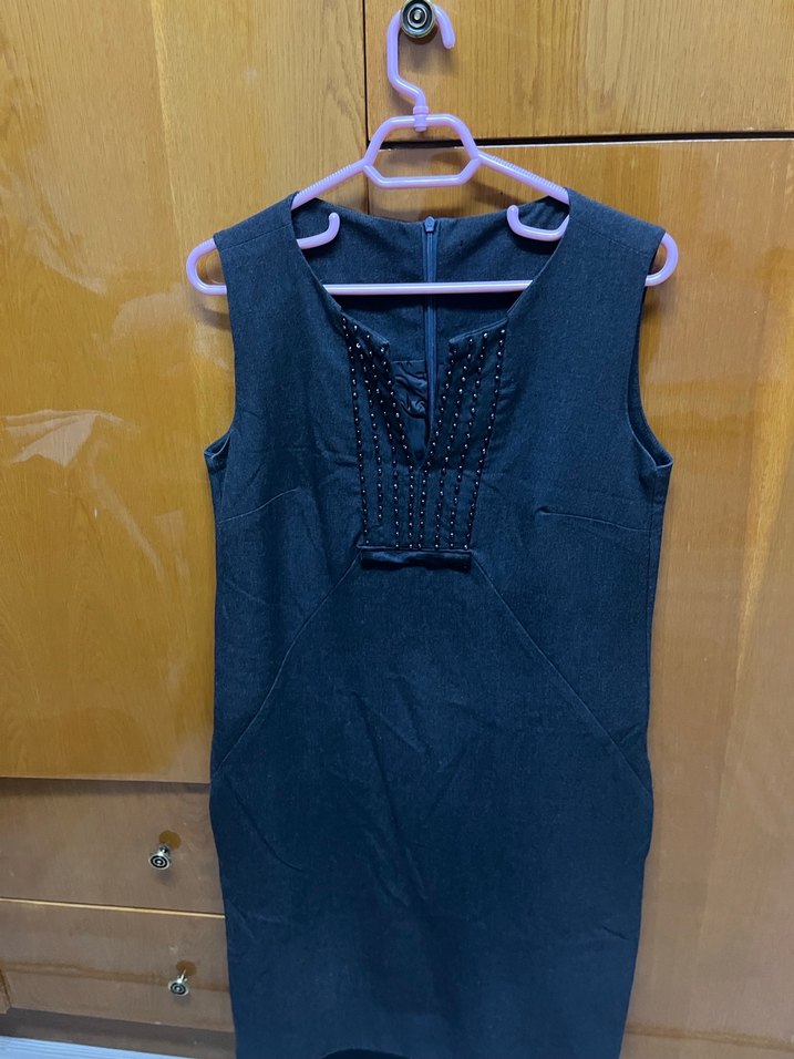 Kolsuz ve V yaka, boncuk detaylı siyah triko elbise. Diz boyu, sırtında fermuarlı ve vücuda oturan kesim, günlük kullanım için uygundur.