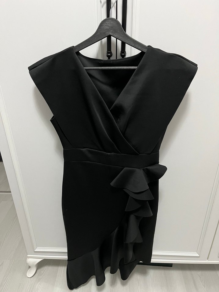 Siyah, v yakalı, kolsuz ve yan kısmında fırfır detaylı, dar kesim mini elbise. Gotik ve Paris tarzını yansıtan şık tasarım.