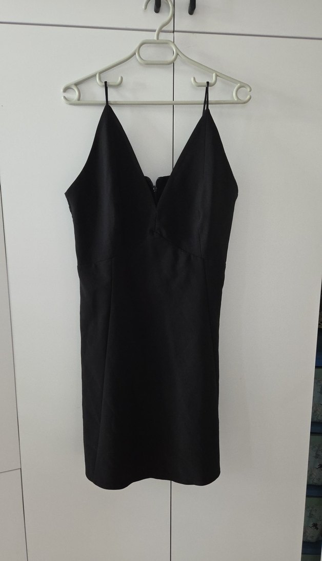 Bu siyah, v yakalı ve kolsuz midi elbise, drapeli detaylara sahip, romantik akşamlar için uygun bir seçimdir.