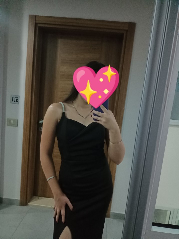 Parlak siyah, v yakalı ve askılı kollu, saten dokulu midi elbise. Cesur ve göz alıcı goth tarzına uygun.