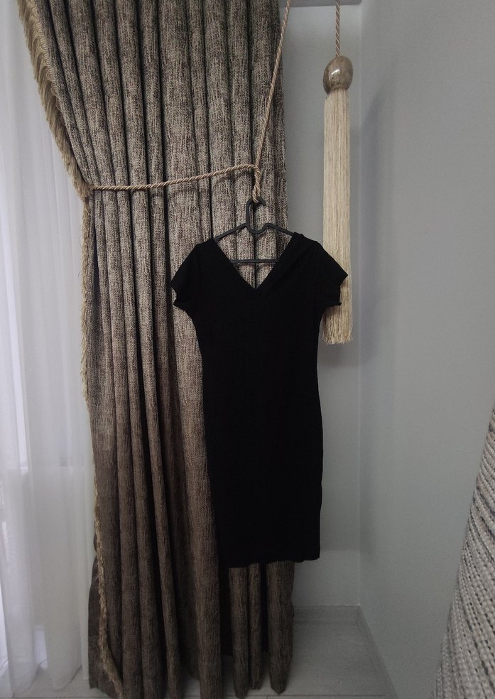 Siyah, v yakalı, kısa kollu elbise , kullanılmadı ölçüleri 102cm boyu 45cm genişlik