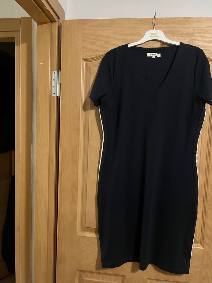 Siyah midi elbise, v yakalı ve kısa kolludur. Yumuşak sentetik kumaştan üretilmiş olup, günlük kullanım için rahat ve şık bir görünüme sahiptir.