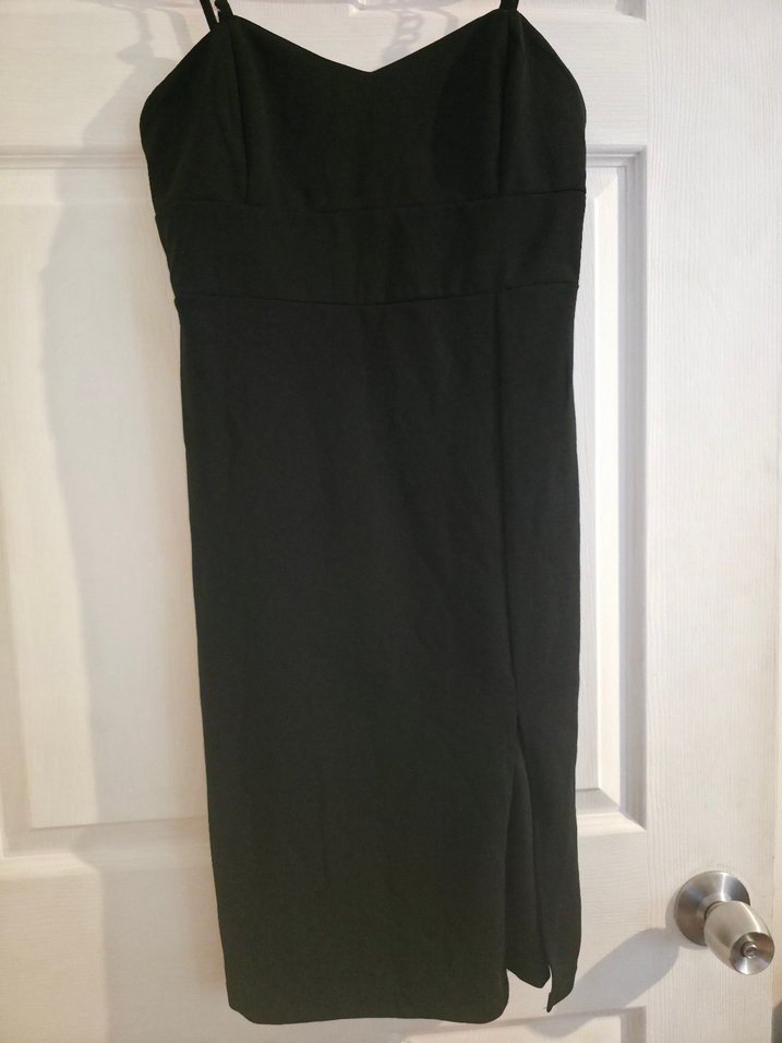 V yaka, ince askılı, yırtmaçlı siyah midi elbise, minimalist gotik tarzda ve ofis için uygundur.