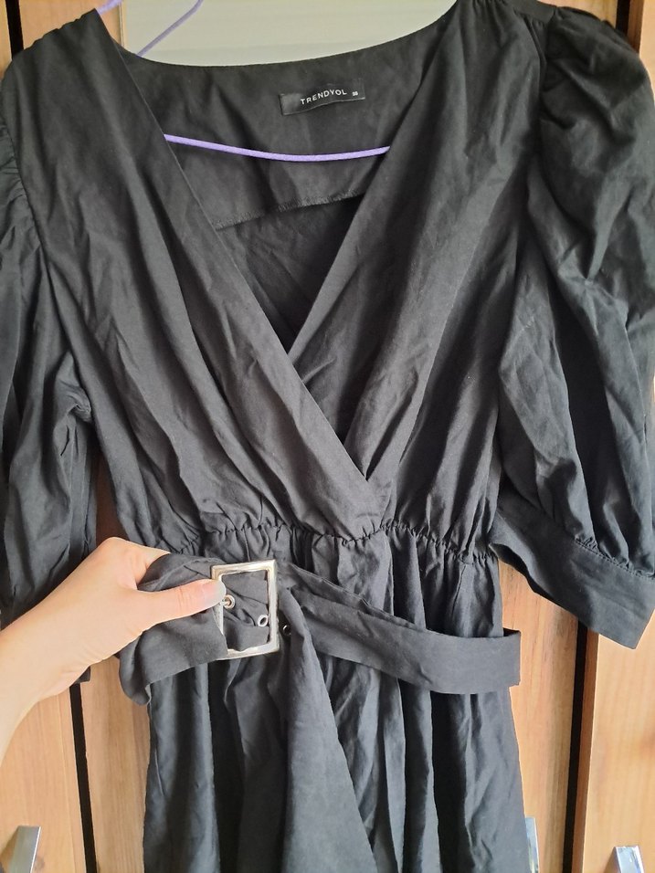 V yakalı, askılı kollu, siyah fit kesim elbise Normal midi boyda, kemerli ve desensiz tasarıma sahiptir.