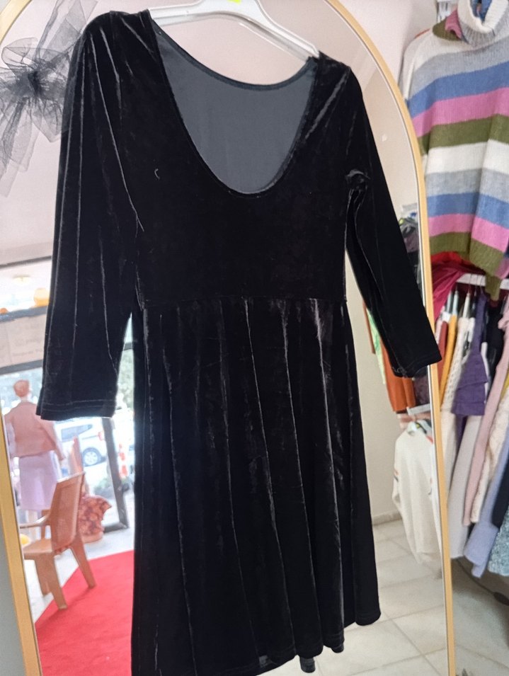 V yaka, uzun kollu siyah midi elbise, yumuşak kumaştan ve drapeli detaylı. Gotik tarzda romantik akşamlar için uygun.