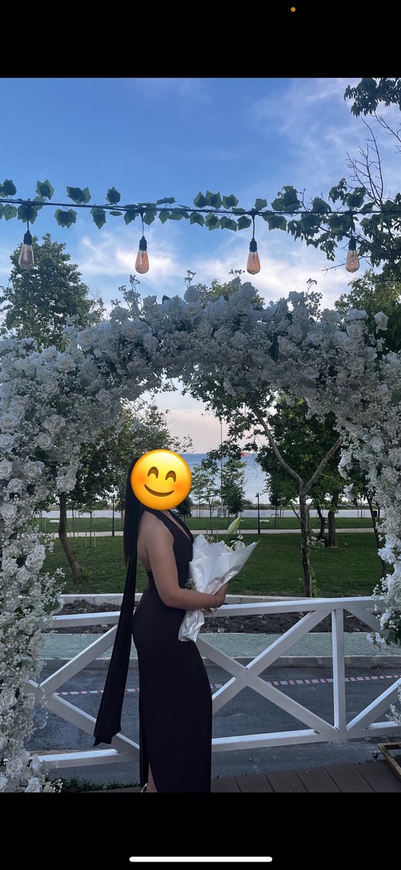 Siyah, V yakalı, askılı, drapeli ve desenli midi uzunlukta, oturan kesim gotik mezuniyet elbisesi. Düğün ve şık etkinlikler için uygun.