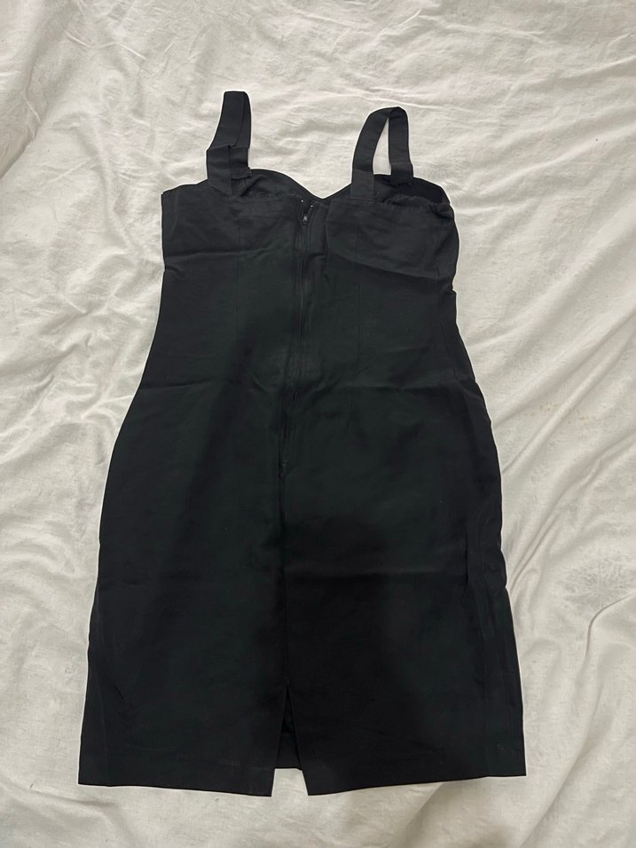 Siyah, v yakalı, askılı ve fermuarlı midi kalem elbise, yumuşak sentetik kumaştan yapılmıştır ve hareket kolaylığı için hafif yırtmaç içerir.