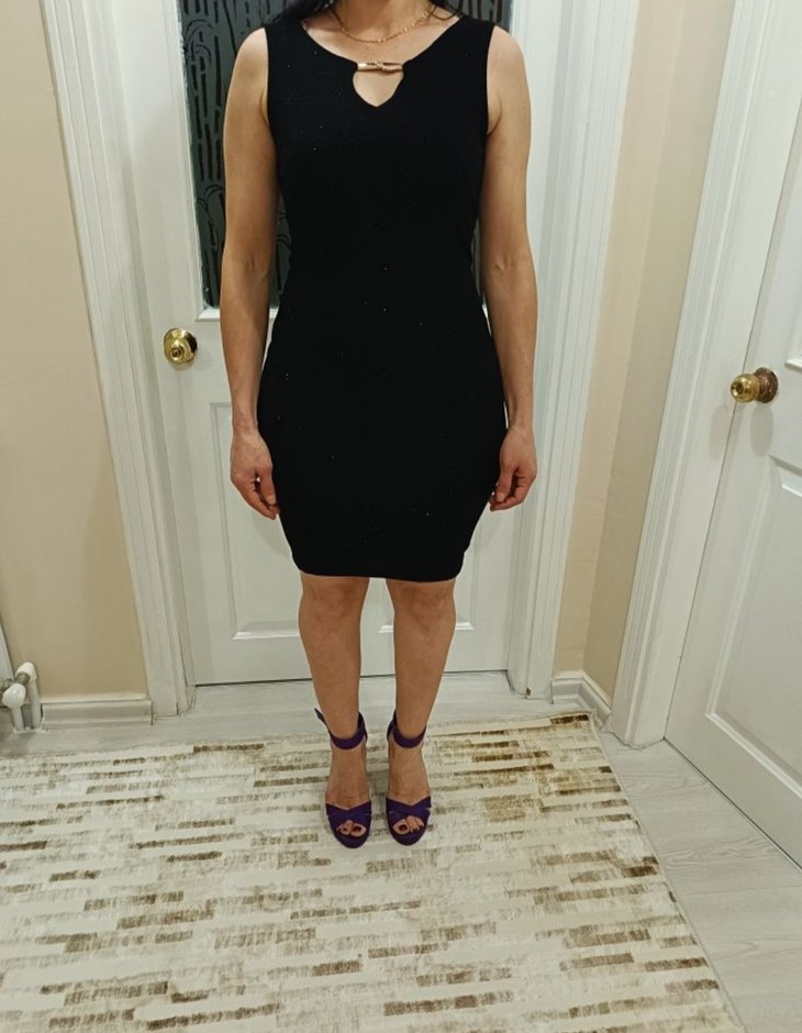 V yaka ve ince askılı, siyah, midi boy kalem elbise. Düz, sentetik kumaştan, romantik akşamlar için şık ve kendinden emin bir seçim. Sadece 1 kez giyilmiş, tertemizdir. Şık, sade ve vücuda oturan kesimiyle zamansız bir modeldir. Ön kısmında küçük dekolte detayı bulunur, zarif bir görünüm sağlar. Kumaşı kaliteli ve tok duruşludur, esneme yapmaz. Hiçbir leke, sökük veya deformasyon yok. M beden, likralı simli, taşlı tokalı. Profilimdeki diğer elbise, abiye modellerine de göz atabilirsiniz #siyah #minielbise #klasikstil #geceelbisesi #tekgiysi #şık #zamansızmoda #abiye #elbise #siyah #kadın #simli