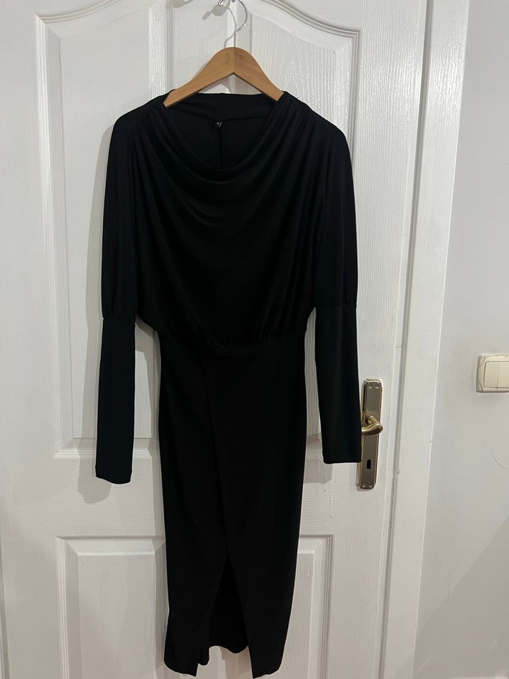 Siyah midi kalem elbise, V yaka ve askılı kollu, rahat kesimle ofis için zahmetsiz şıklık sunar.
