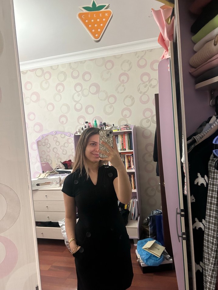 V yakalı, kısa kollu, siyah ve baskılı midi elbise. Minimalist ve gotik tarzı bir araya getirir, şık ve dar kesimdir. Ofis için uygun.