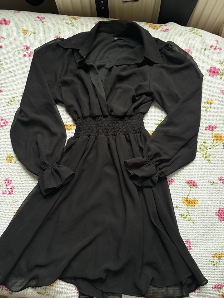 Siyah, V yakalı, bol kesim midi elbise. Drapeli tasarımı ve uzun kollu yapısıyla ofis için uygundur. Gotik tarzda şık bir seçim.