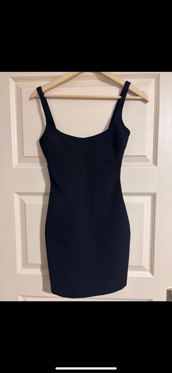 Siyah, V yakalı ve askılı midi boy dar kesim elbise. Beden xs yeni etiketli hiç kullanılmamıştır