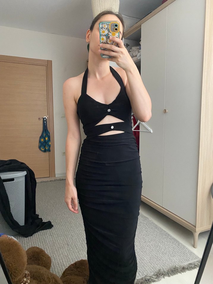 Siyah V Yakalı Midi Strappy Elbise