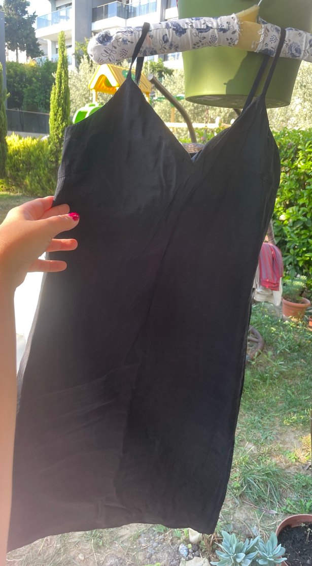 Siyah midi elbise, ince askılı ve V yakalıdır. Sentetik dokusu yumuşak ve drapeli detay içerir, dış mekan kullanımı için uygundur.