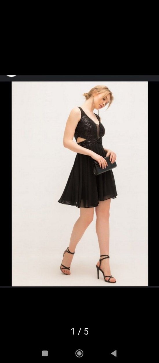 Siyah renkli, V yakalı, askılı kısa ve beli pencere detaylı, pullu payetli abiye elbise, göğüs dekoltesindeki tül kapatılmıştır. Cesur ve gotik parti stiline uygundur.