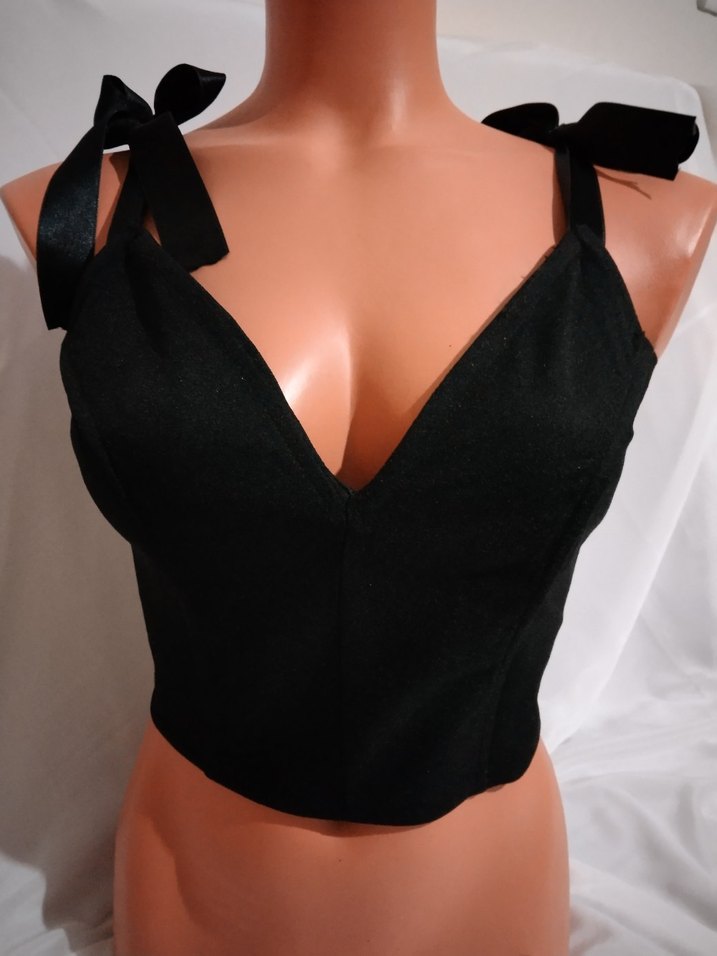 Siyah, v yakalı,, askıları bağlamalı, mini uzunlukta, sıkı oturan bustiyer. Romantik ve gotik tarz için uygun.