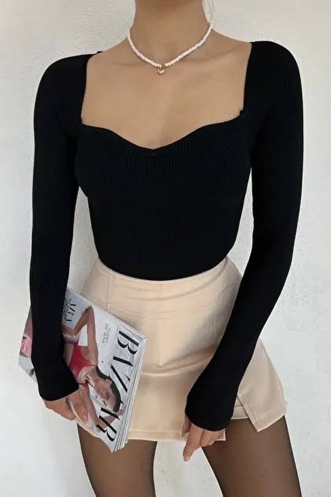 V yakalı, uzun kollu ve kısa kesim siyah büstiyer. Hafif sentetik kumaştan, sokak modasına uygun, zahmetsiz şıklık sunar. ✨