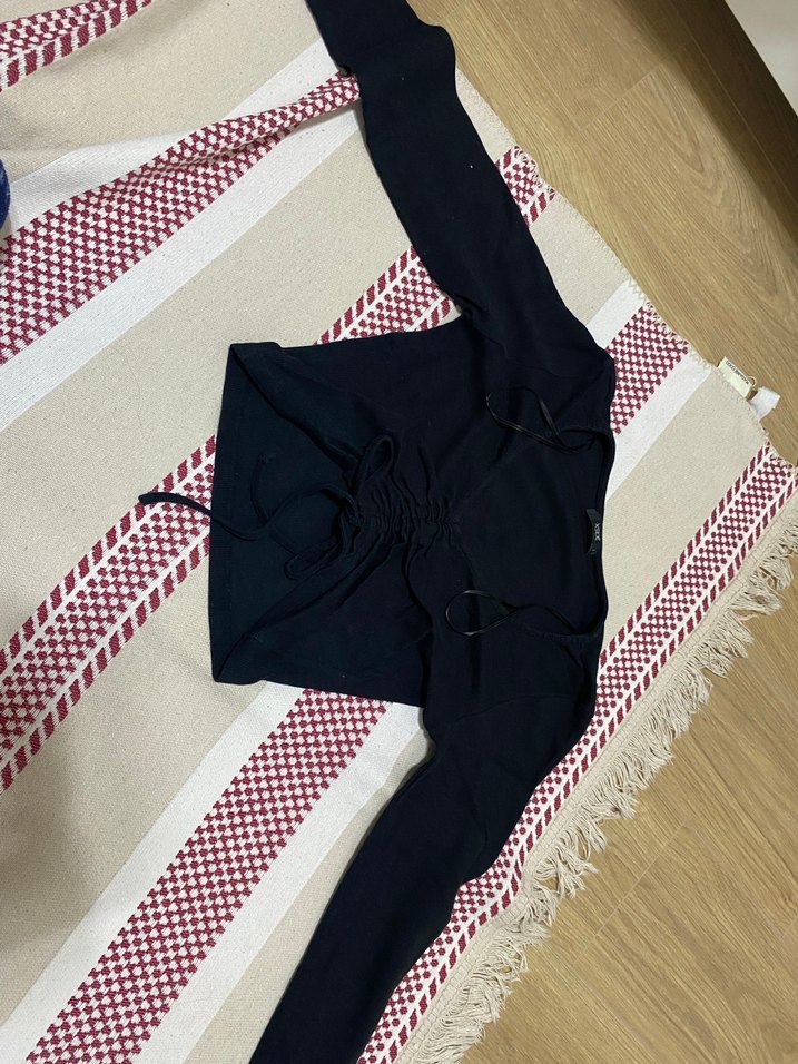 Siyah, v yakalı, uzun kollu ve önü büzgülü bu fitted kadın crop