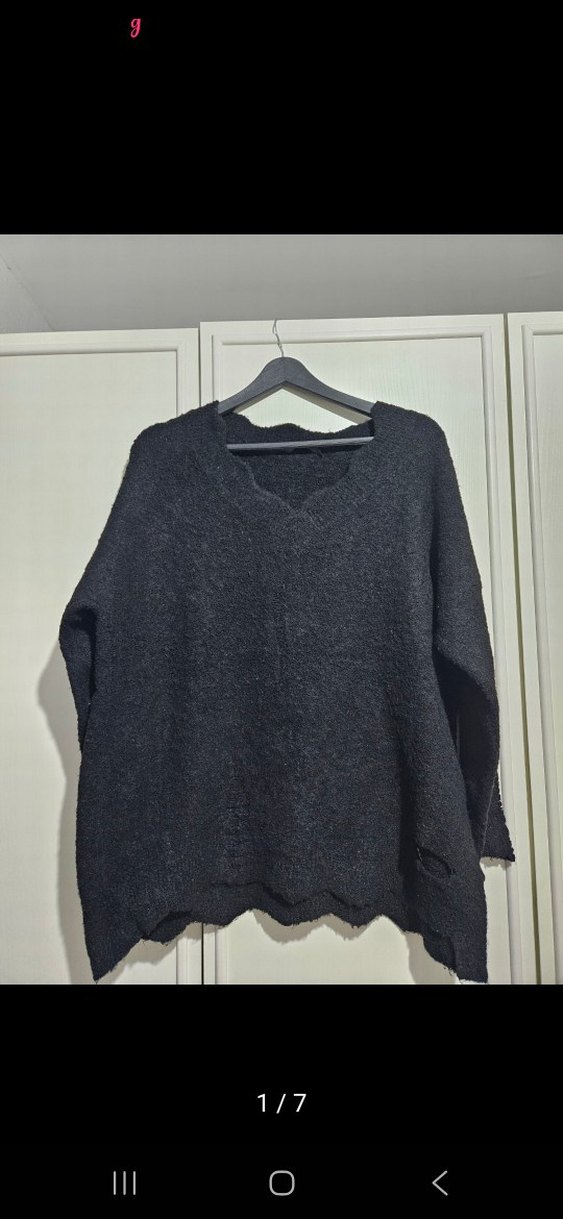 V yaka, uzun kollu, siyah örgü kadın kazak, rahat ve günlük kullanıma uygun bol kesim. kendinden yırtıkları var. orfeonegro marka