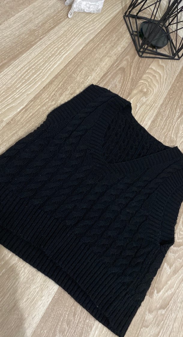 Siyah renkli, V yakalı, örgü dokulu ve salaş kesim kadın süveter, günlük kullanıma uygun rahat bir stil sunar.