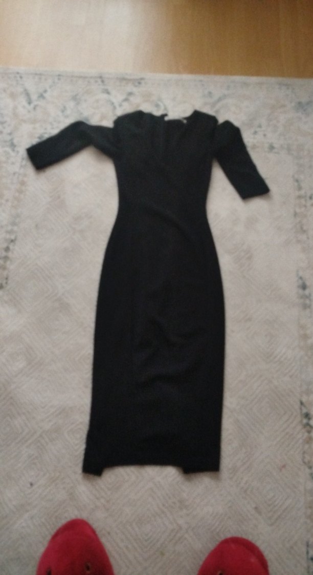 Siyah uzun ve dar kesim elbise, V yakalı ve uzun kolludur. Kürk detayları gotik bir hava katar. Ofis kullanımı için uygundur. Elbise özel dikimdir arka kısmında yırtmacı vardır. kalçaya tam oturması için tasarlanmıştır. tam kalıptır esneme payı yoktur. marka temsilidir