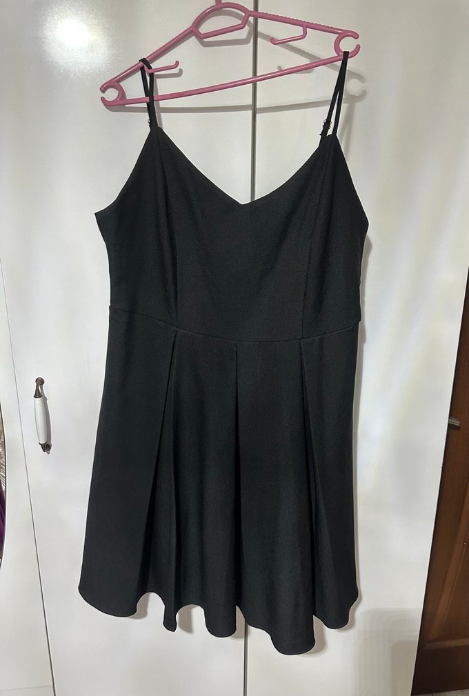 Siyah, V yakalı ve ince askılı pilili midi elbise. Minimalist ve gotik tarzda, günlük kullanıma uygun sade bir model.
