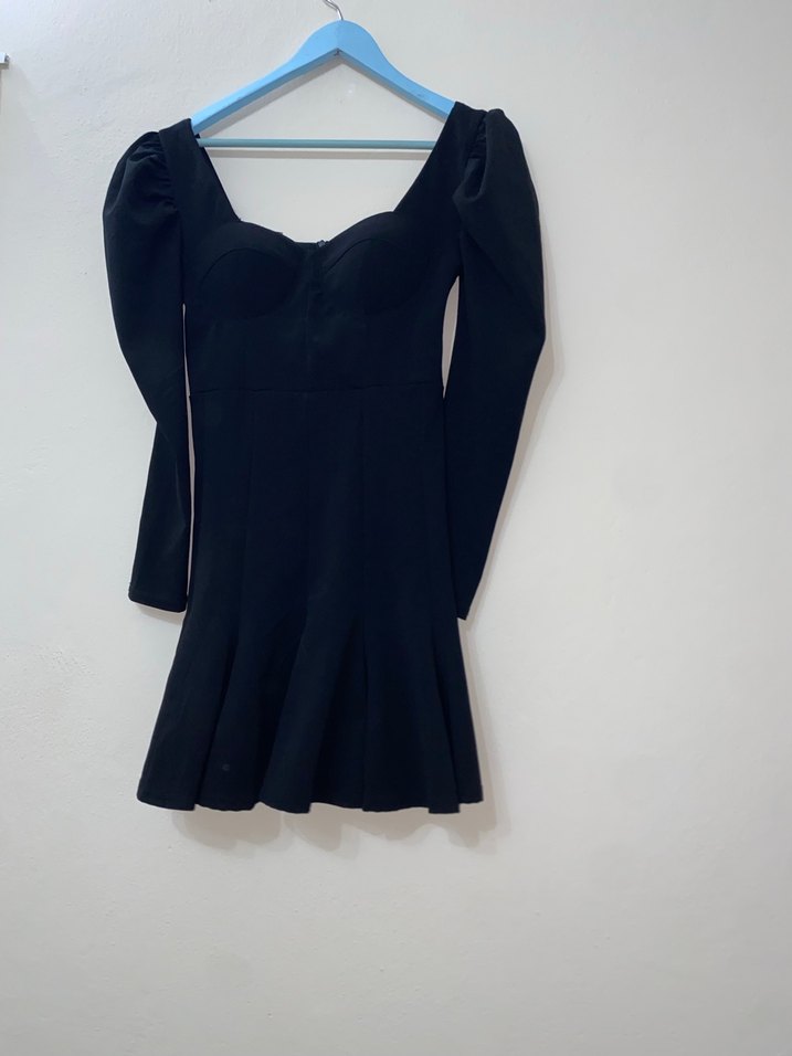 Siyah, V yakalı ve uzun kollu, vücuda oturan midi elbise. Piliseli etek kısmı ile sade detaylar sunar. Minimalist gotik stil için uygundur. 1 kere giyildi