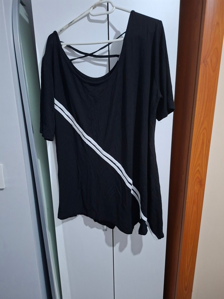 Siyah renkli, V yakalı ve askılı hamile tişörtü. Salaş kesimi ve çapraz beyaz şerit detaylı, yumuşak sentetik kumaştan, günlük rahat kullanım için uygun.