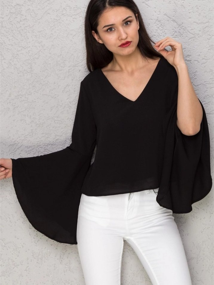 Siyah bluz, V yakalı, uzun drapeli kollar ve salaş kesimle, ipeksi dokuda günlük kullanım için uygun gotik tarzda. koltuk altı ölçüsü 51 cm boy 49 cm