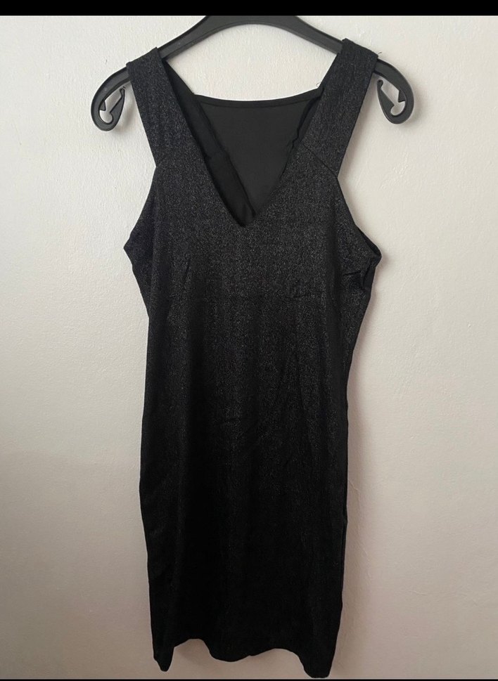 Siyah, V yakalı, kolsuz ve simli tasarıma sahip, fit kesim midi goth elbise. Düz ve koyu renklidir, parti için uygundur. Esnek sert kumaşlı, bel 35 cm, kalça 40 cm, boy 87 cm
