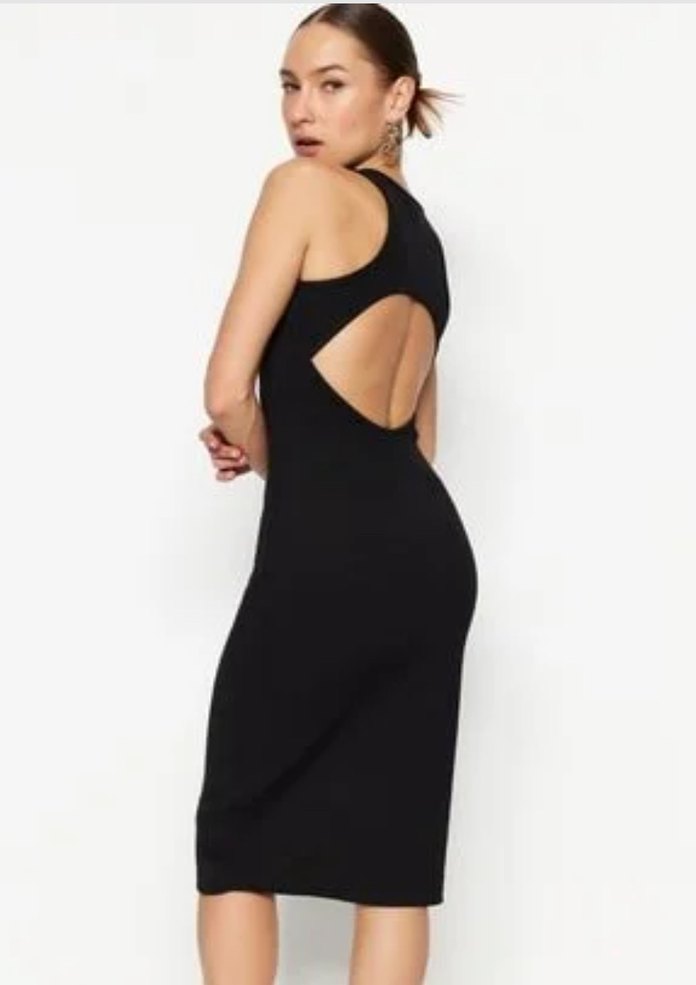 Siyah, v yakalı ve sırt dekolteli, kolsuz tasarıma sahip bu dar kesim elbise, modern ve şık bir görünüm sunar.
