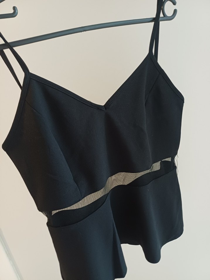 V yakalı, askılı ve ortası tül transparan siyah, dar kesim mini büstiyer. Pürüzsüz sentetik kumaştan, sokak stili için uygun.