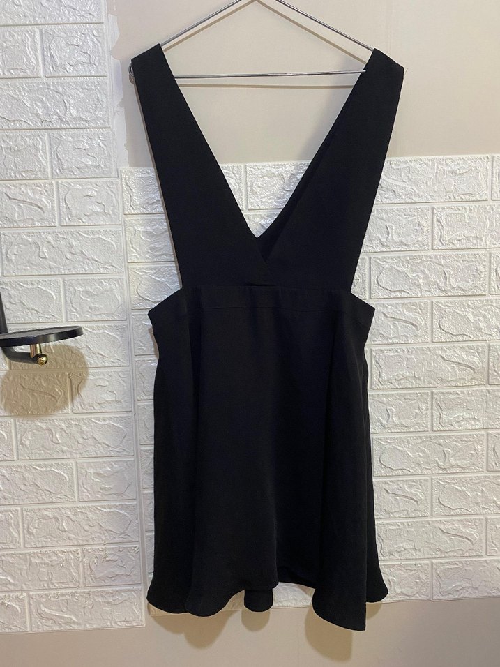 Siyah, V yakalı, askılı mini elbise. Sentetik kumaştan, gotik ve Paris tarzını yansıtıyor.