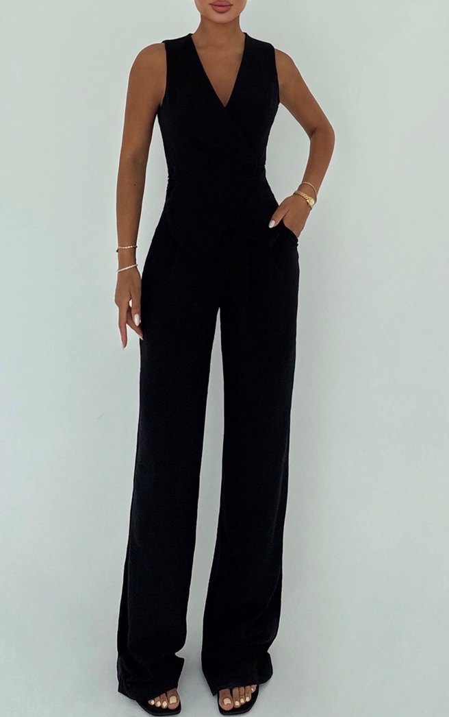 Siyah V yakalı ve askılı kollu, ipeksi dokulu takım Normal kesim ve midi boyda, rahat ve şık günlük sokak stili için uygundur.