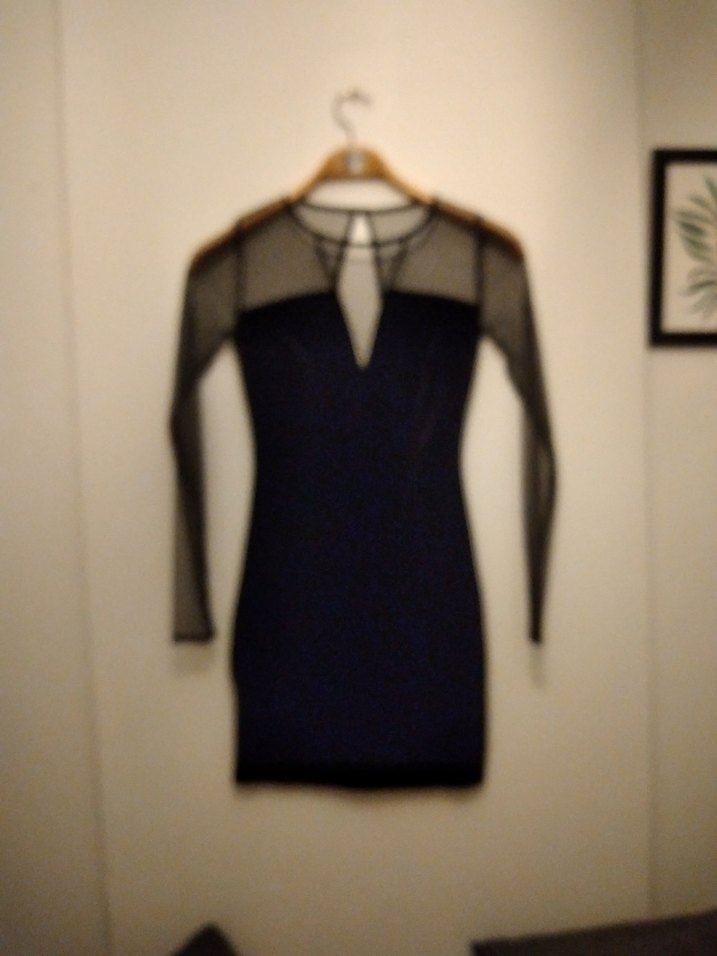 Siyah, V yakalı ve transparan uzun kollu, vücuda oturan midi elbise. Gotik tarzda, romantik akşamlar için uygundur.
